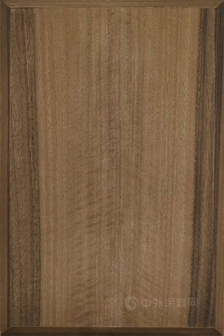 欧洲胡桃木木纹深浅适中,选用流平性较好的WAD9502S威尼斯水性双组份清底漆湿喷,让板材充分润湿。漆膜干透后自然下陷,显现平整光滑的半开放效果。