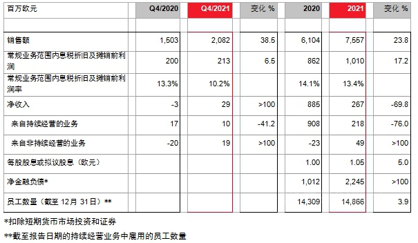 由于汽车工业需求有所恢复,原材料价格上涨得到抵消,工程材料业务板块的销售额大幅上升。销售额达到17.08亿欧元,较上年的11.90亿欧元增长了43.5%。虽然较高的能源和货运成本对收入产生了负面影响,但是常规业务范围内息税折旧及摊销前利润仍然从1.51亿欧元增至2.41亿欧元,增幅达59.6%。常规业务范围内息税折旧及摊销前利润率为14.1%,高于上年的12.7%。