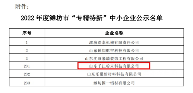 8月8日,潍坊市工业和信息化局下发了《关于公布2022年度潍坊“专精特新”中小企业名单的通知》(潍工信创﹝2022﹞7号),千江高新旗下的山东千江粉末科技有限公司成功入选潍坊“专精特新”中小企业认定名单。