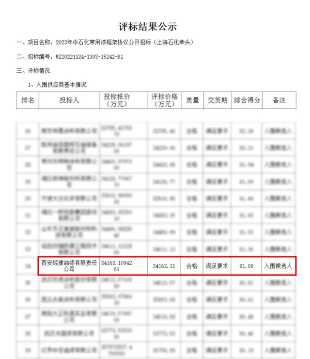 日前,中石化2023年油漆涂料框架协议采购招标拉开帷幕,经过激烈的角逐,西安经建油漆有限责任公司成功中标2023年中石化涂料采购常用漆标段。