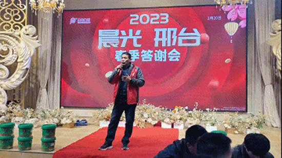 2月20日,“2023晨光春季答谢会”在邢台马凯新食代酒店隆重举行。在晨光集团的大力协助下,邢台分公司毕总为大家带来了一场精彩纷呈的盛宴,以此致谢多年来支持晨光涂料的项目经理、工长及瓦工师傅们。参与本次答谢会的嘉宾共计500余人,晨光集团总经理薛亚波先生、工程漆事业部总经理张明华先生携区域经理们出席并参与了本次盛会。