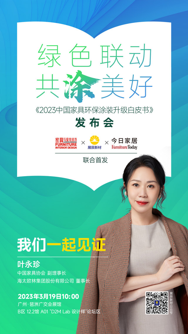 为全面解读中国家具行业发展现状、分享家具环保涂装升级解决方案、助力家具企业实现低碳目标,预测家具环保涂装未来前景与趋势等,展辰新材联合中国家具行业第一本全国中文核心期刊《家具与室内装饰》杂志与全球家居业商业指南《今日家居》,即将在中国家具行业首次发布《2023中国家具环保涂装升级白皮书》,为促进行业绿色健康可持续发展献上微薄之力。