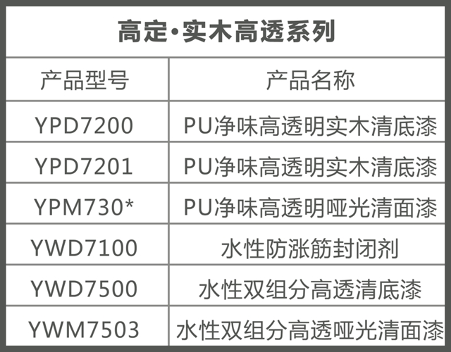 实木高透系列有PU和水性2个产品体系,从底漆到面漆都有,产品全面,都能实现“薄、闪、透、活”的涂装效果,手感润滑,易打磨,易施工。而且可以通过涂装工艺设计提供全油性、油底水面和全水性多种高效涂装方案,解锁实木涂装痛点,多元化满足不同客户的涂装需求。
